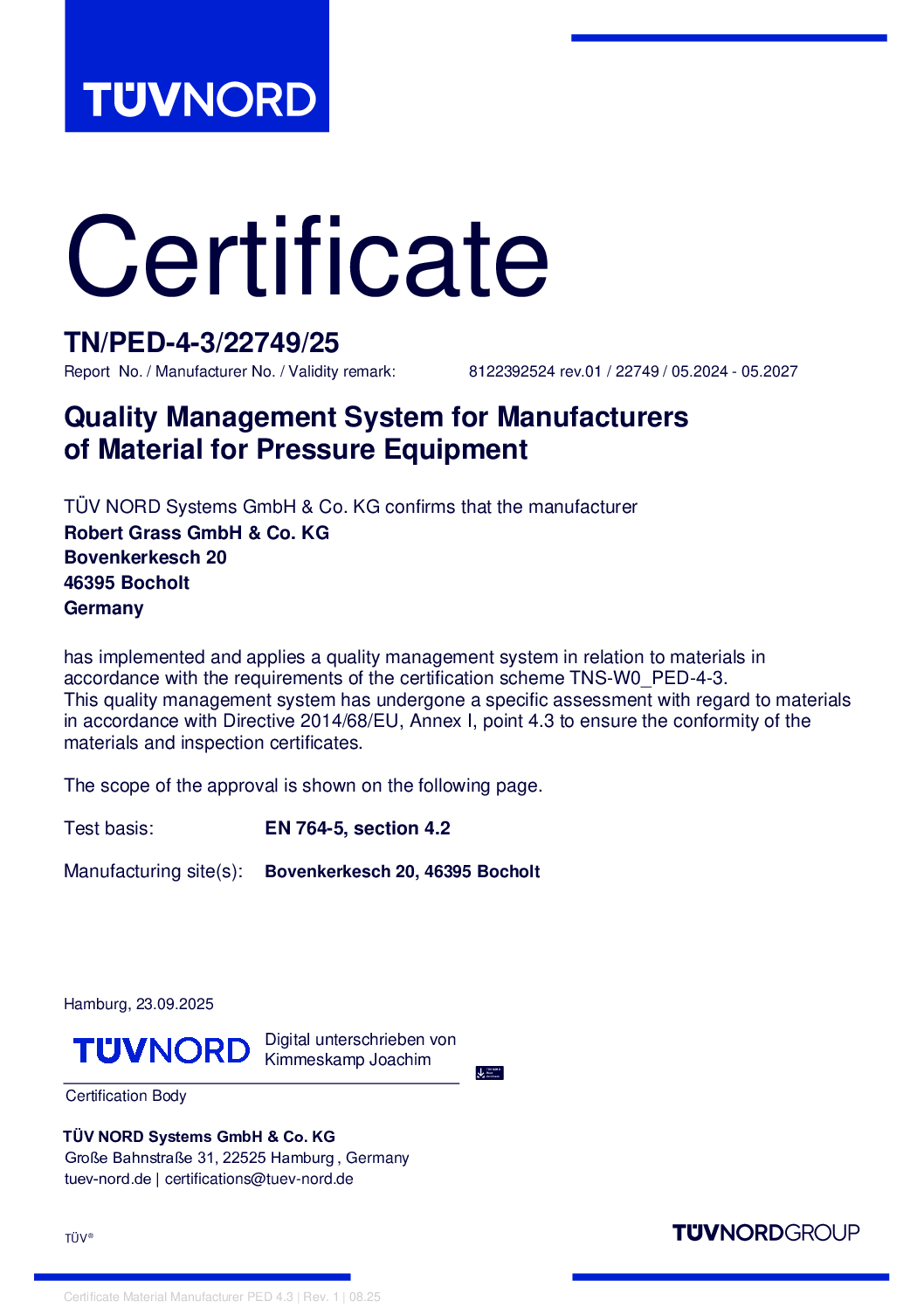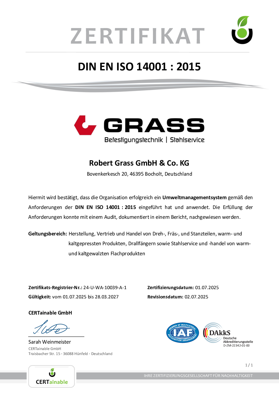 Unsere Produkte tragen eine große Verantwortung. Das ist der Grund, warum kein einziges Produkt ungeprüft unser Haus verlässt. Denn unsere Produkte finden sich in Anwendungen wieder, bei denen Reklamationen sicherheitsrelevante Auswirkungen haben würden. Daher prüfen wir jedes einzelne Produkt – dieser QM-Prozess ist zertifiziert. Wir verfügen über die Zertifizierung nach DIN EN ISO 9001:2015 und DIN EN ISO 14001:2015.